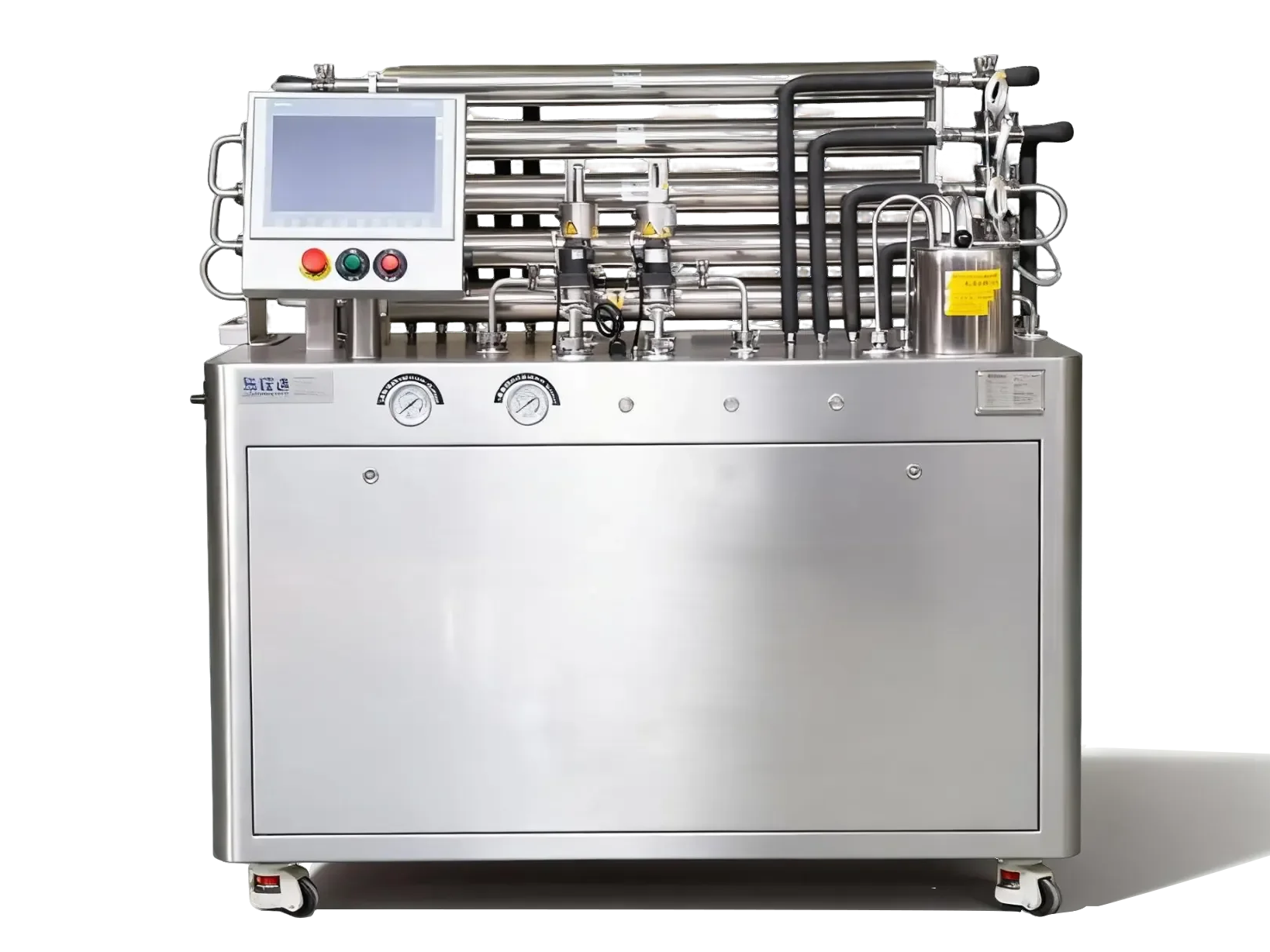 The PT-20T Series UHT Tubular Sterilizer fully simulates industrial production conditions. The design structure includes a preheating section, heating section, and cooling section. It can be equipped with online homogenization and aseptic filling according to customer requirements. The equipment is compact and forms a complete system, with only tap water and electricity required for external connections. The control panel provides centralized control and can be connected to a computer for software-based control of the main unit. The tubular components are manufactured according to custom specifications, creating a defined turbulence that improves heat exchange efficiency.